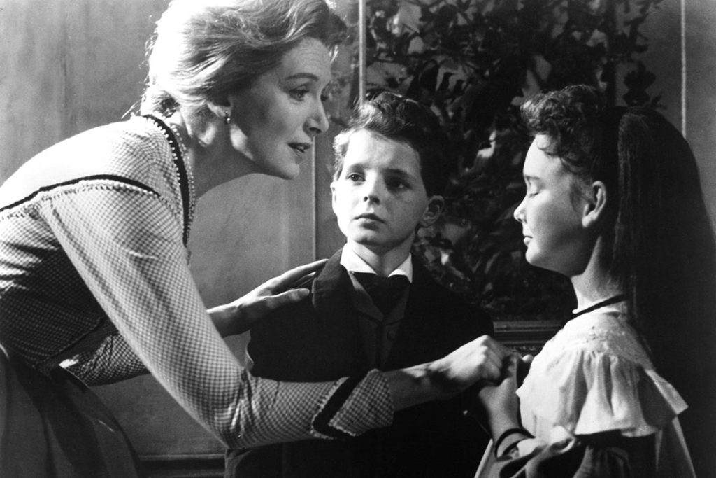 Abre cartel The Innocents (Los inocentes.1961), obra maestra de Jack Clayton inspirada en la novela Otra vuelta de tuerca, de Henry James, y que destaca por su manejo de la ambigüedad y el terror psicológico, al narrar la trama de una institutriz que, al llegar al cuidado de los niños de una mansión, experimenta sucesos inquietantes.